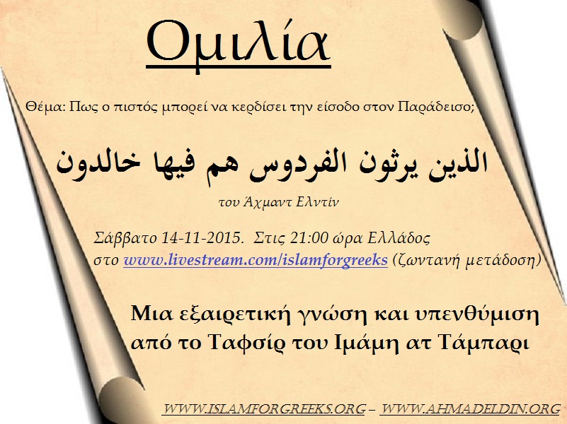 Σάββατο 14-11-2015 – Στις 21:00 ώρα Ελλάδος στο www.livestream.com/islamforgreeks σε ζωντανή μετάδοση