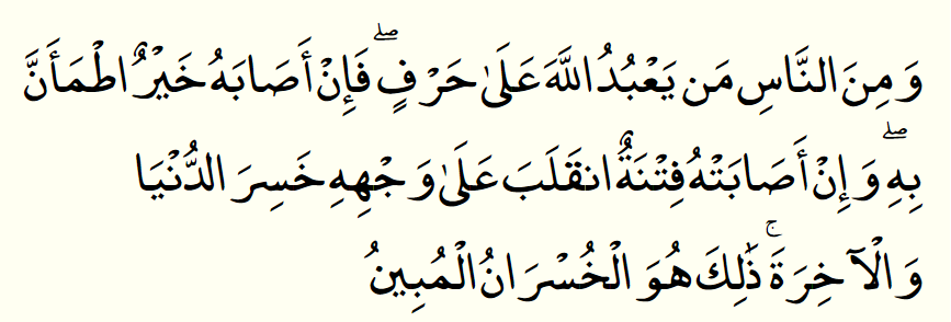 وَمِنَ النَّاسِ مَن يَعْبُدُ اللَّهَ عَلَىٰ حَرْفٍ ۖ فَإِنْ أَصَابَهُ خَيْرٌ اطْمَأَنَّ بِهِ ۖ وَإِنْ أَصَابَتْهُ فِتْنَةٌ انقَلَبَ عَلَىٰ وَجْهِهِ خَسِرَ الدُّنْيَا وَالْآخِرَةَ ۚ ذَٰلِكَ هُوَ الْخُسْرَانُ الْمُبِينُ