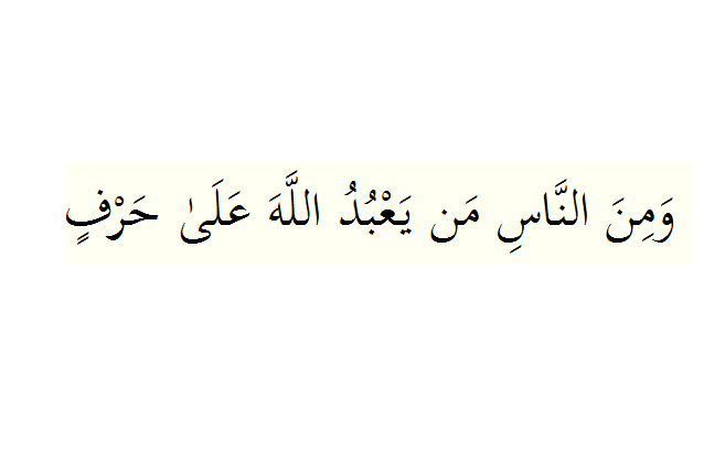 وَمِنَ النَّاسِ مَن يَعْبُدُ اللَّهَ عَلَىٰ حَرْفٍ ۖ فَإِنْ أَصَابَهُ خَيْرٌ اطْمَأَنَّ بِهِ ۖ وَإِنْ أَصَابَتْهُ فِتْنَةٌ انقَلَبَ عَلَىٰ وَجْهِهِ خَسِرَ الدُّنْيَا وَالْآخِرَةَ ۚ ذَٰلِكَ هُوَ الْخُسْرَانُ الْمُبِينُ