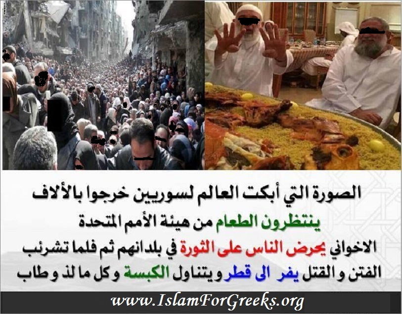 [Στα αριστερά ο Συριακός λαός σε εξαθλίωση – Στα δεξιά ο Ουάτζντι Γουνέμ (ηγετικό στέλεχος των Μ.Α) με το σήμα της Ράμπαα, καλοπερνάει κάνοντας επανάσταση]