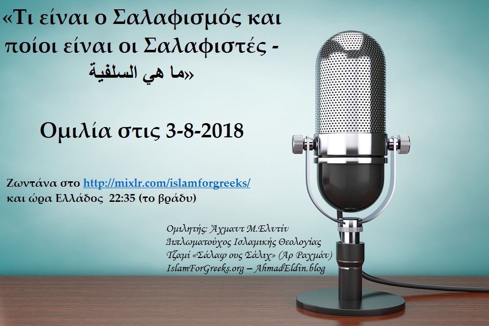 Την Παρασκευή στις 3-8-2018, και ώρα Ελλάδος 22:35 (το βράδυ) θα πραγματοποιηθεί ζωντανή ομιλία στην διαδικτυακή πλατφόρμα http://mixlr.com/islamforgreeks/ με την θεματολογία: «Τι είναι ο Σαλαφισμός και ποίοι είναι οι Σαλαφιστές»