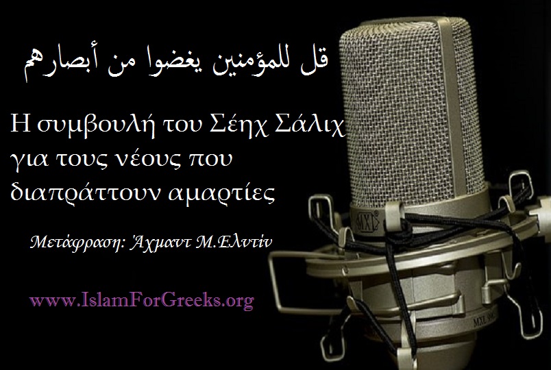 Να αποφεύγεις να βλέπεις το κακό στην τηλεόραση η το κακό που προωθείται στις αγορές, να τα αποφεύγεις όλα αυτά και μην το λαμβάνεις αυτό ως κάτι ασήμαντο. Η ματιά (στην αμαρτία) είναι δηλητηριασμένο βέλος, από τα βέλη του σατανά, όπως είπε ο Προφήτης صلى الله عليه وسلم. Που χτυπάει αυτό το βέλος; Χτυπάει κατευθείαν στην καρδιά. Κάθε φορά που κοιτάς, αυτό το βέλος σε χτυπάει στην καρδιά και την τραυματίζει. Δεν είναι μόνο ένα βέλος, αλλά είναι και δηλητηριασμένο. Γιαυτο να αποφεύγεις την ματιά (στην αμαρτία) και μην το θεωρείς κάτι ασήμαντο. Να δραπετεύσεις από την παράνομη ματιά σε αυτά που απαγόρεψε ο Αλλάχ.