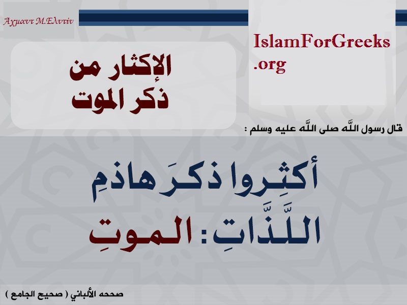 Ο θάνατος είναι ο καταστροφέας των επίγειων απολαύσεων. Έτσι τον ονόμασε ο Προφήτης Μουχάμαντ صلى الله عليه وسلم και μας συμβούλεψε να τον θυμόμαστε συχνά