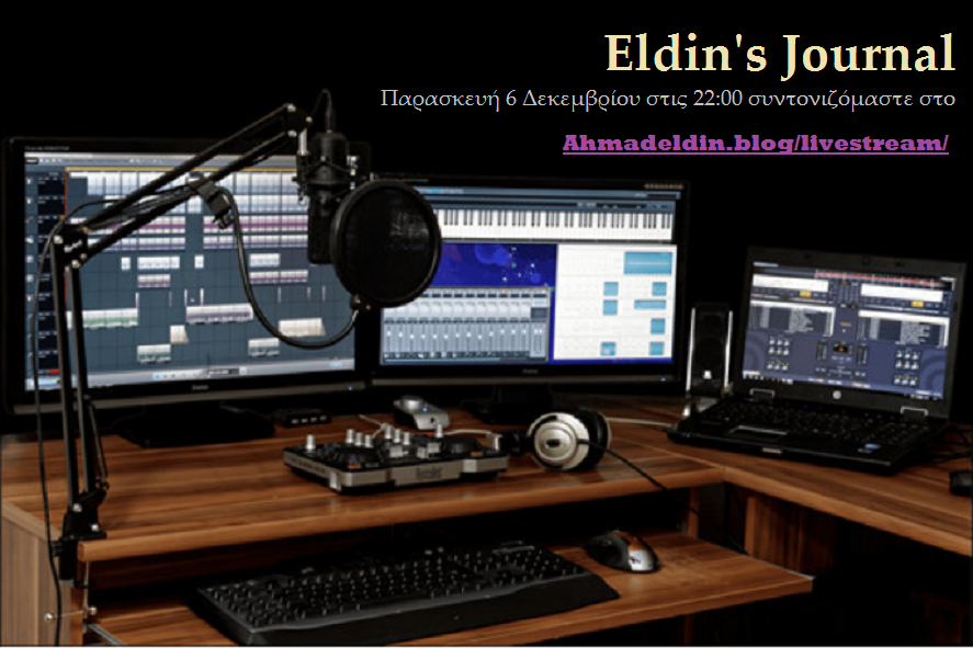 To Eldin’s Journal είναι εδώ, επίσημα, και θα εκπέμπει ζωντανά, κάθε Παρασκευή η δυο Παρασκευές το μήνα, στις 10 το βραδύ (ώρα Ελλάδας). Η πρώτη μας εκπομπή θα μεταδοθεί ζωντανά στις 6 Δεκεμβρίου (2019) στον ειδικά διαμορφωμένο διαδικτυακό χώρο του AhmadEldin.blog. Δεν χρειάζεστε κωδικούς, ούτε εγγραφές, απλά πατάτε το λίνκ και σας βγάζει κατευθείαν στο media player που θα παρουσιάζεται η εκπομπή στη καθορισμένη ώρα και ημέρα.