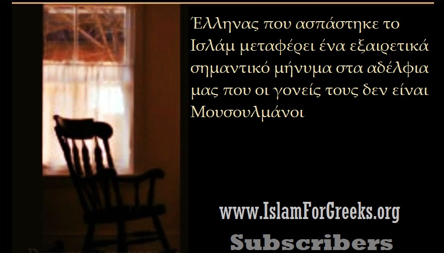 Ο Χρήστος είναι από τους παλαιότερους αναγνώστες του IslamForGreeks. Ασπάστηκε το Ισλάμ το 2011. Στο βίντεο που ακολουθεί θα παρακολουθήσετε μια συζήτηση που έχω με τον αδελφό μας, όχι για να μας πει την ιστορία του, για το πώς ανακάλυψε και ασπάστηκε το Ισλάμ, αλλά για τον πρόσφατο χαμό του πατέρα του. Ο αδελφός μας εξιστορήσει τις διάφορες προσπάθειες που επιχείρησε έτσι ώστε ο πατέρας του να γνωρίσει το Ισλάμ. Το βίντεο αυτό περιέχει ένα εξαιρετικά σημαντικό μήνυμα προς τους Μουσουλμάνους και τις Μουσουλμάνες με γονείς μη Μουσουλμάνους. Ακολουθεί το βίντεο της συζήτησης: