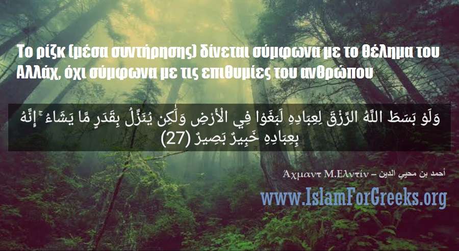 «Κι αν ο Αλλάχ έδινε άφθονα τα μέσα για τη συντήρηση των δούλων Του, θα παρανομούσαν στη γη. Αλλά (τα) στέλνει με μέτρο κάτω (στη γη) – όπως θέλει – Γιατί με τους δούλους Του είναι Έμπειρος και Προσεκτικός (βλέπει καλά και τους ξέρει καλά)» {Κοράνι 42:27}