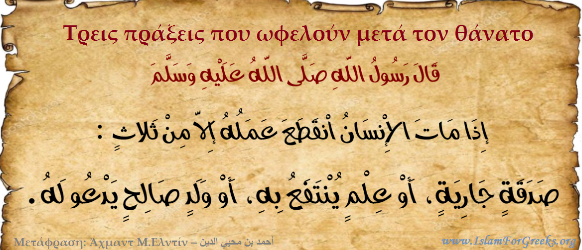 Ο Προφήτης Μουχάμαντ صلى الله عليه وسلم ενημερώνει τους πιστούς για τρεις εξαιρετικές ενάρετες πράξεις, οι οποίες θα σταθούν ως πηγές ωφέλειας για τον πιστό μετά τον θάνατο. Διαβάζουμε σε αυθεντική του ρήση: