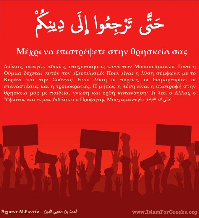 Διώξεις, σφαγές, αδικίες, στοχοποιήσεις κατά των Μουσουλμάνων. Γιατί η Ούμμα δέχεται αυτόν τον εξευτελισμό; Ποια είναι η λύση σύμφωνα με το Κοράνι και την Σούννα; Είναι λύση οι πορείες, οι διαμαρτυρίες, οι επαναστάσεις και η τρομοκρατίες; Η μήπως η λύση είναι η επιστροφή στην θρησκεία μας με παιδεία, γνώση και ορθή κατανόηση; Τι λέει ο Αλλάχ ο Ύψιστος και τι μας διδάσκει ο Προφήτης Μουχάμαντ صلى الله عليه و سلم