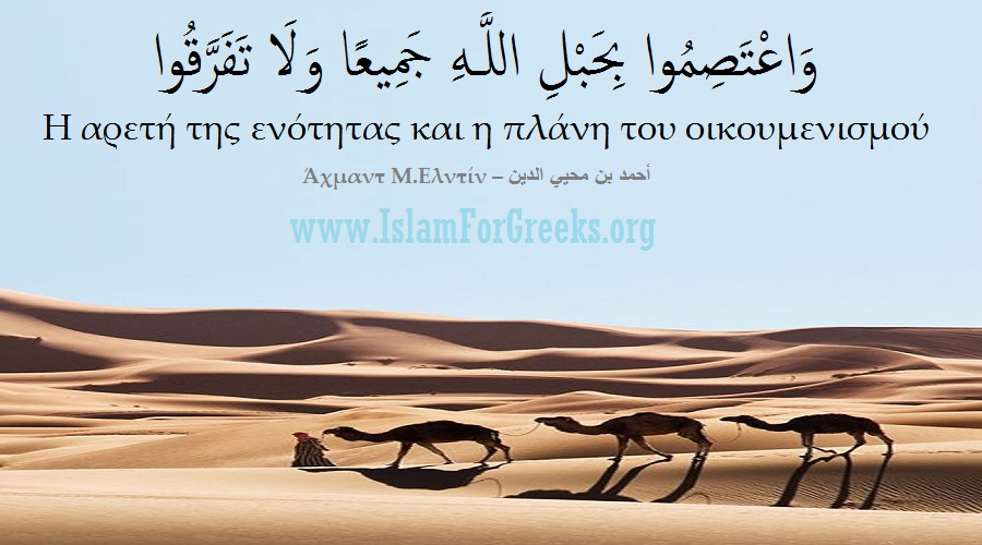 Ο Αλλάχ δεν έχει αφήσει την θρησκεία του να ορίζεται από τον καθένα, την έχει συγκεκριμενοποιήσει από το Κοράνι και την Σούννα. Και όσο γιαυτους που καλούν στην πλανεμένη ένωση (οικουμενισμός) με λόγια του τύπου «ελατέ να ενωθούμε σε αυτά που συμφωνούμε και ας αφήσουμε αυτά που διαφωνούμε» τότε αυτό σίγουρα είναι ένας λόγος άστοχος και αιρετικός. Διότι η ένωση πρέπει να γίνει καθώς πρέπει και έτσι όπως ορίζει ο Αλλάχ, δηλαδή πάνω στο Ταουχίντ και στην Σούννα του Προφήτη, με την κατανόηση των Σάλαφ ους Σάλιχ (πρωτορθόδοξων Μουσουλμάνων), και όχι ένωση στην αίρεση, στην πλάνη, στην αμαρτία και με μεθοδολογίες ξένες προς το Ισλάμ.