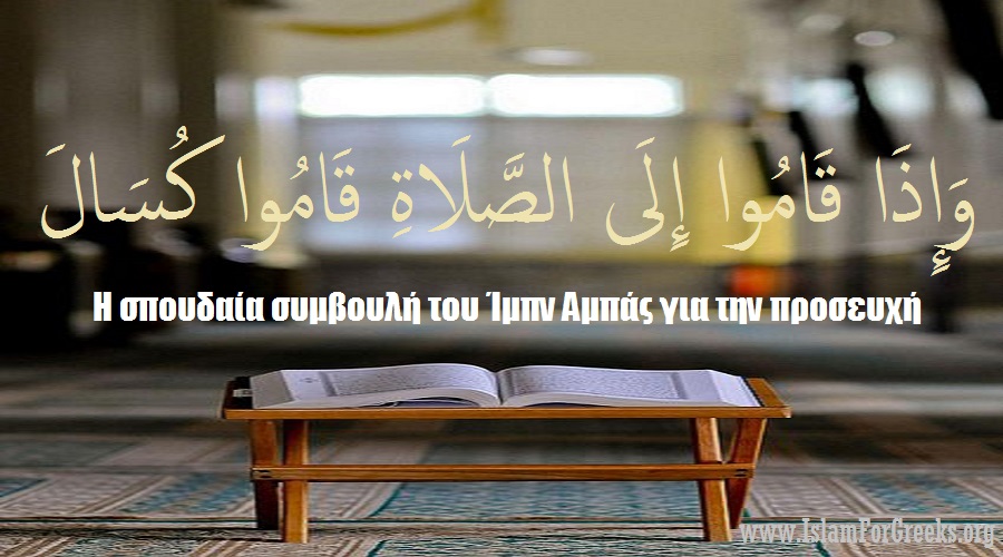 «Θα σας υπαγορεύσω κάτι σημαντικό γιαυτό σημειώστε το. Ο Ίμπν Αμπάς رضي الله عنه είπε: Δεν είναι αρεστό για ένα άτομο να προσφέρει την προσευχή σε κατάσταση τεμπελιάς. Ωστόσο, οφείλει να προσφέρει την προσευχή σε κατάσταση ευτυχίας, έχοντας μεγάλη επιθυμία (να προσευχηθεί) και να έχει μεγάλη χαρά. Διότι πράγματι, (εκείνη την ώρα) συζητά με τον Αλλάχ και ο Αλλάχ βρίσκεται μπροστά του. Τον συγχωρεί και απαντά στην προσευχή του όταν τον επικαλείται.