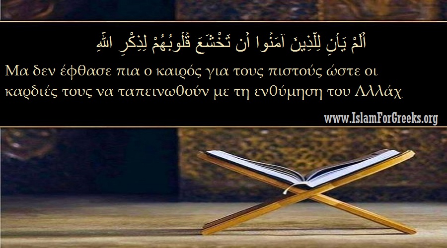«Μα δεν έφθασε πια ο καιρός για τους πιστούς ώστε οι καρδιές τους να ταπεινωθούν με τη ενθύμηση του Αλλάχ και με την Αλήθεια (το Κοράνιο) που (τους) έχει αποκαλυφθεί; (έτσι ώστε) να μη μοιάσουν μ’ εκείνους που τους δόθηκαν παλαιότερα οι γραφές (Τοράχ – Ευαγγέλιο), που πολύς καιρός πέρασε πάνω τους και σκλήρυναν οι καρδιές τους. Κι ανάμεσα τους πολλοί είναι διεφθαρμένοι και ανυπάκουοι» {Κοράνι 57:16}