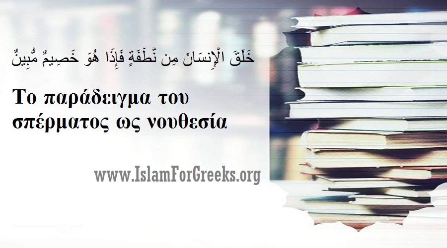 «Και έπλασε τον άνθρωπο από υγρά (σεξουαλικής συνεύρεσης-σπέρμα), και να τώρα που (τολμά να) στέκεται ως αντίπαλος-ανταγωνιστής» {Κοράνι 16:4}