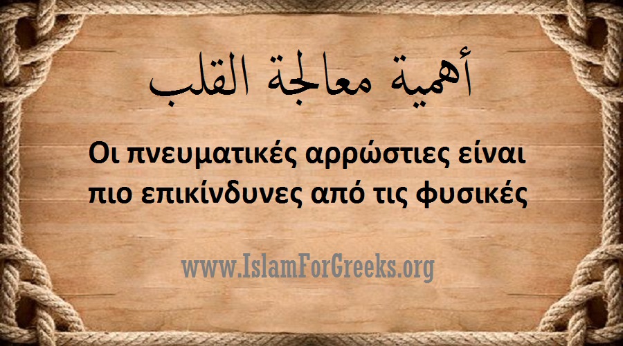 Γιαυτο λοιπόν ο Μουσουλμάνος οφείλει να φροντίσει την καρδιά του, με περισσότερη φροντίδα και από τις φυσικές αρρώστιες οπου πηγαίνει σε νοσοκομεία, κέντρα θεραπείας, αναζητώντας θεραπεία για τις φυσικές αρρώστιες. Οι πνευματικές αρρώστιες είναι πιο σοβαρές και επικίνδυνες.
