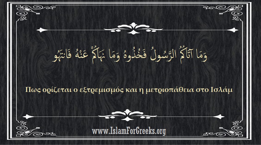 Η μετριοπάθεια λοιπόν δεν ορίζεται με βάση το τι νομίζουμε εμείς ως μετριοπάθεια αλλά ορίζεται με βάση τις εντολές του Ύψιστου και τις διδασκαλίες του Προφήτη του. Το ίδιο ακριβώς αφορά και τον εξτρεμισμό. Ο Προφήτης صلى الله عليه وسلم είπε: