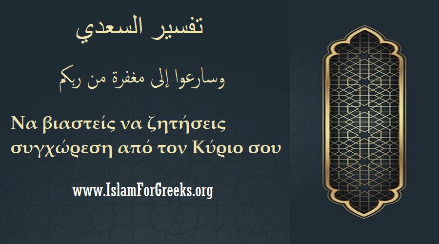 {Και βιαστείτε (πορευθείτε) για την συγχώρηση απ’ τον Κύριο σας, και για τον παράδεισο, που είναι πλατύς, όσο και οι ουρανοί κι η γη, και που προετοιμάστηκε για τους Μουτακούν (θεοσεβείς).