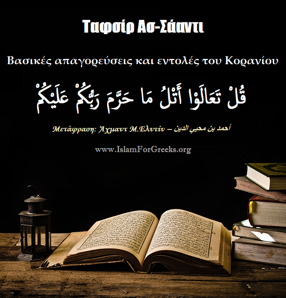 «Πες: «Ελατέ να σας απαγγείλω αυτά που ο Κύριος σας απαγόρευσε για σας: «Να μην συνεταιρίζεται με Αυτόν κανέναν και τίποτα. Να συμπεριφερθείτε στους γονείς σας με καλοσύνη. Να μην σκοτώνετε τα παιδιά σας (με φόβο) για την φτώχεια, θα σας προμηθεύσουμε ό,τι χρειάζεστε για τη συντήρηση τη δική σας κι εκείνων. Να μην πλησιάζετε τις ανηθικότητες (αμαρτίες), είτε φανερές είτε κρυφές. Να μην σκοτώνετε τη ψυχή που ο Αλλάχ έχει απαγορέψει, εκτός για δίκαιους λόγους (όταν το ορίζει ο νόμος). Μ’ αυτά σας υποχρεώνει Αλλάχ, έτσι ώστε να λογικευτείτε.