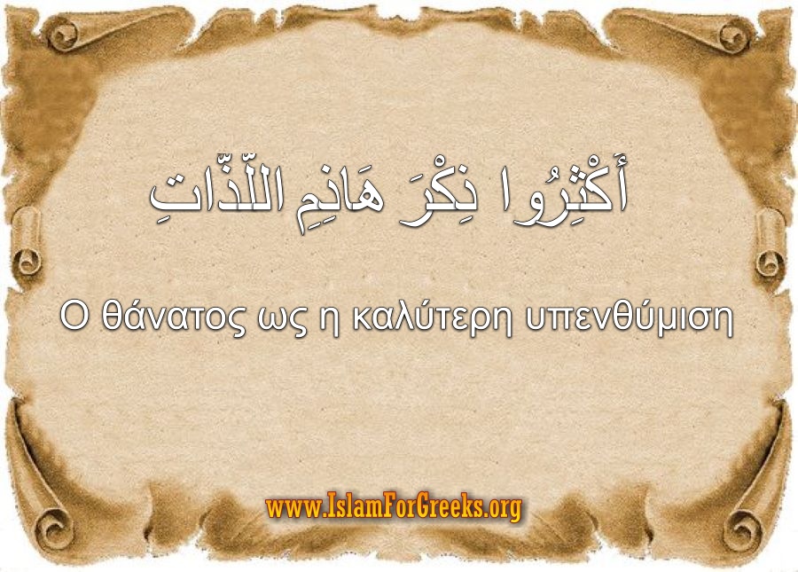 Ο θάνατος είναι ο καταστροφέας των επίγειων απολαύσεων. Έτσι τον ονόμασε ο Προφήτης Μουχάμαντ صلى الله عليه وسلم και μας συμβούλεψε να τον θυμόμαστε συχνά