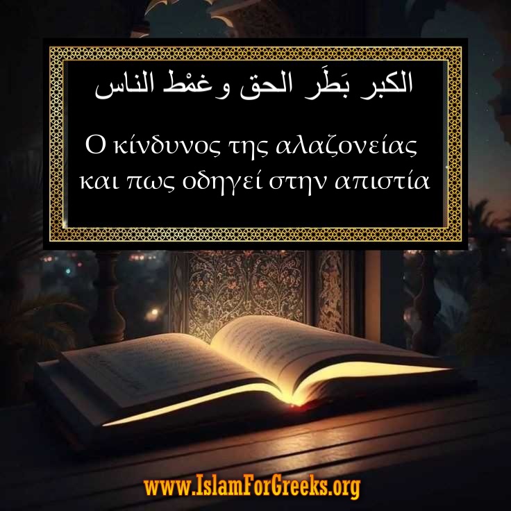 Η αλαζονεία είναι ένα συναίσθημα και χαρακτηριστικό που συναντάται συχνά στην ανθρώπινη συμπεριφορά, με καταστροφικές συνέπειες για την ψυχή και την κοινωνία. Είναι μια από τις βασικές αιτίες που οδηγεί τον άνθρωπο στην άρνηση της αλήθειας και στην απομάκρυνση από τον ορθό δρόμο. Στο Ισλάμ η αλαζονεία αποτελεί μια από τις κύριες αμαρτίες που εμποδίζει την αποδοχή της αλήθειας και της πίστης. Το παράδειγμα του Σατανά και η στάση του απέναντι στην εντολή του Αλλάχ του Υψίστου τονίζει τη σοβαρότητα και τον κίνδυνο της αλαζονείας η οποία μπορεί εύκολα να οδηγήσει στην απιστία.