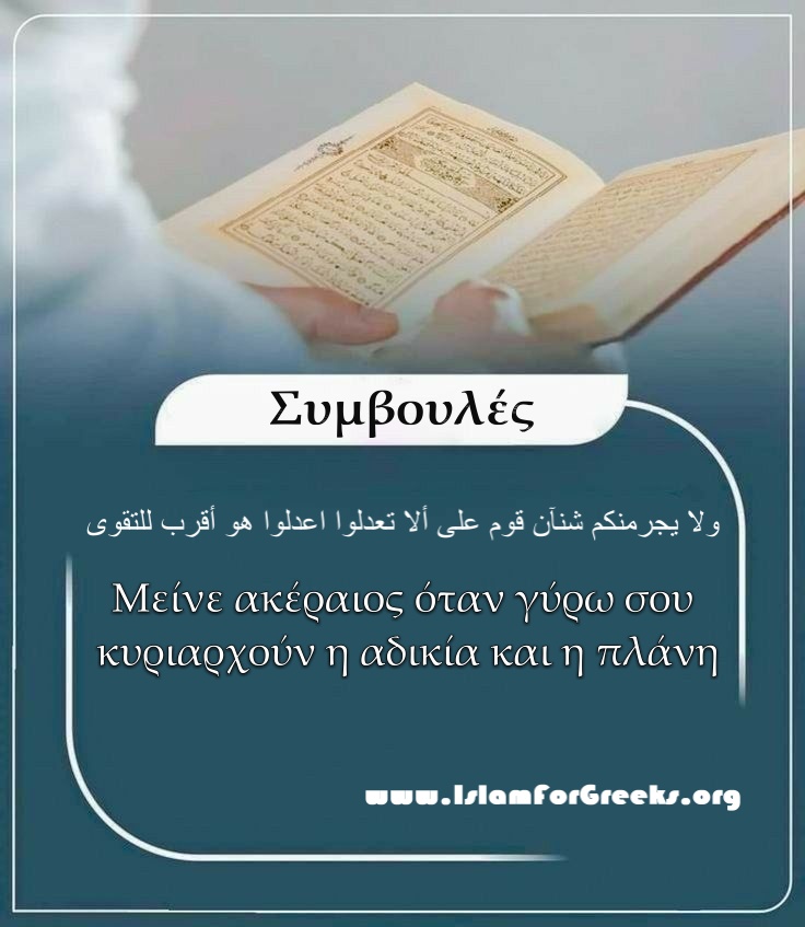 Η αδικία που έχεις υποστεί δεν σου δίνει το δικαίωμα να αδικήσεις κι εσύ. Μην ανταποδώσεις την αδικία με αδικία, αλλά με δικαιοσύνη. Ο Αλλάχ είναι υπέρ αρκετός ως Υποστηρικτής. Ο Ύψιστος λέει για τους πιστούς: «και αντιμετωπίζουν (εμποδίζουν) το κακό κάνοντας το καλό» {Κοράνι 13:22}. Δεν μπορείς να αντιμετωπίσεις το κακό κάνοντας το ίδιο κακό, αλλά το εμποδίζεις με ενάρετη συμπεριφορά. Ο Ύψιστος λέει επίσης: «Ω σεις οι πιστοί! Να στέκεστε σταθερά στο δίκαιο. Η μαρτυρία σας να είναι πλήρως για τον Αλλάχ, κι αν χρειαστεί (για λόγους δικαιοσύνης), ακόμα κι αν είναι εναντίον του εαυτού σας ή των γονέων και των συγγενών σας…» {Κοράνι 4:135}.