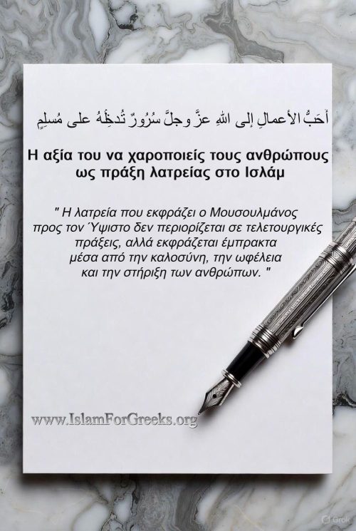 Ο Προφήτης Μουχάμαντ صلى الله عليه وسلم δεν δίδαξε έναν απομονωμένο ασκητισμό, αλλά μια ζωντανή πίστη που αγγίζει τις καρδιές, θεραπεύει τις πληγές και χτίζει κοινωνίες. Μέσα από τα αυθεντικά χαντίθ διαπιστώνουμε ότι πράξεις που συχνά υποτιμώνται, όπως το να χαροποιήσεις έναν άνθρωπο, να σταθείς δίπλα του στη δυσκολία του ή να συγκρατήσεις την οργή σου, έχουν τεράστια βαρύτητα ενώπιον του Αλλάχ.