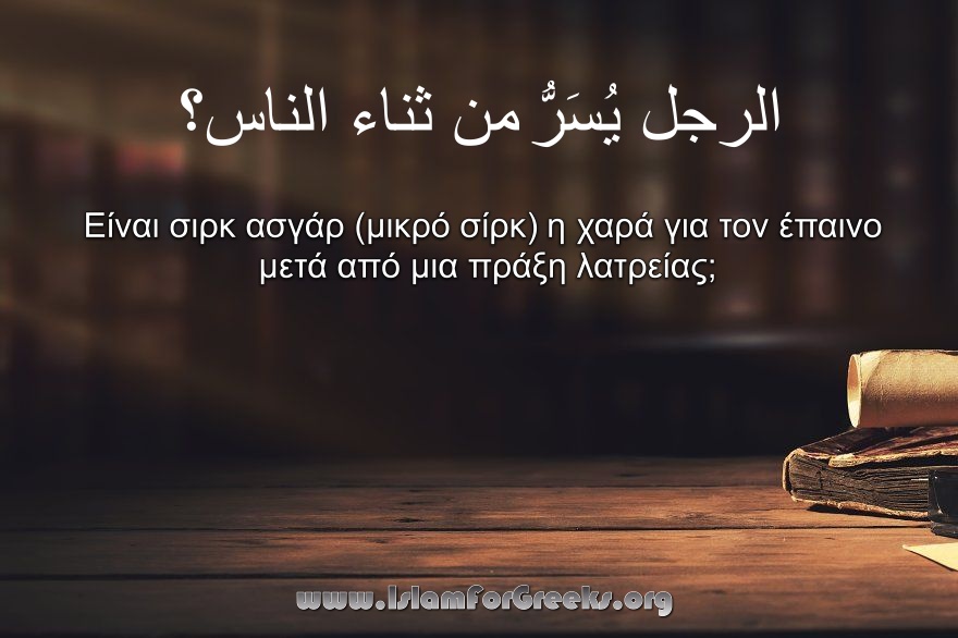 «Ορισμένες φορές μπορεί να κάνουμε κάποια πράξη λατρείας νομίζοντας πως είναι μόνο για τον Αλλάχ, αλλά μετά συνειδητοποιουμε πως αν κάποιος μας επαινέσει γιαυτό, μας αρέσει… Ωστόσο, στην αρχη της πραξης, δεν είχαμε καμία πρόθεση να το κάνουμε για να κερδίσουμε τον θαυμασμό κανενός αλλά νιώθουμε ότι τα κοπλιμέντα δηλητήριαζουν το ιχλάς μας. Και άλλες φορές περιμένουμε να ακούσουμε καλά λόγια για κάτι που έχουμε κάνει, παρόλο που δεν το κάναμε για να ακούσουμε καλά λόγια, το κάναμε για να ευχαριστήσουμε τον Αλλάχ. Όλα αυτά, πέφτουν στην κατηγορία της ριγιά/σιρκ ασγαρ; και αν όχι, μειώνουν το ατζρ που θα έχουμε από τον Αλλαχ;»